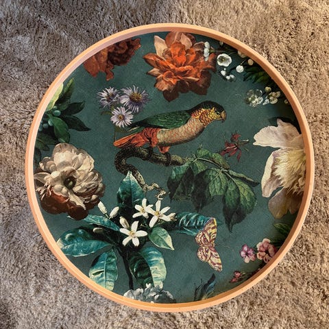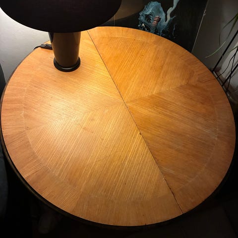 Vintage rundt teak bord med en lille rund hylde nedeunder. Kan bruges til forskellige formål. Højde: 65cm / Ø: 55cm / hylden Ø: 41cm. Kun kontanter og personlig afhentning på Amager, Jenagade.