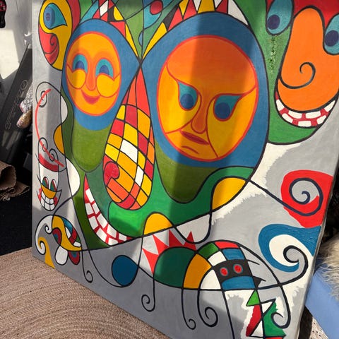 Abstrakt maleri af ukendt kunstner i stærke, flerfarvede nuancer med blandt andet gul, rød, sort, blå og hvid. Motivet består af lag af farvefelter, tekstfragmenter og grafiske elementer, som giver et udtryk med dybde og struktur. Velegnet som vægdekoration i stue, kontor eller andre opholdsrum. Maleriet er udført på lærred og signeret i nederste hjørne. Mål: 100 x 100 cm