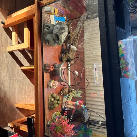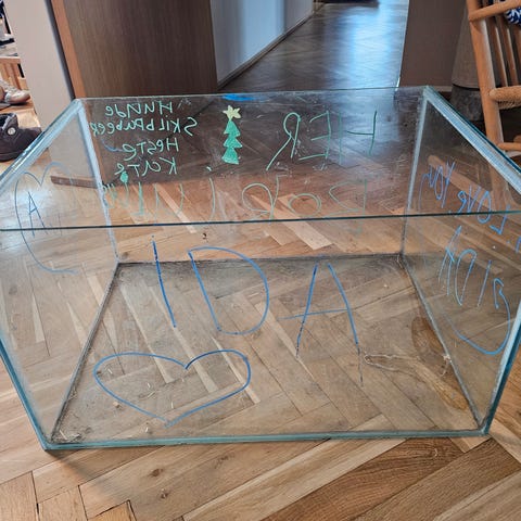 Akvarium i glas med diverse tilbehør. I akvariet medfølger flere dekorationer, blandt andet slots- og skibsfigurer samt kunstige planter. Der ses slanger til luft/filtrering på billederne. Egnet til hold af mindre akvariefisk eller som dekorativt akvarium i hjemmet. Størrelse og mærke er ikke angivet og måles står ved billeder så lidt hver