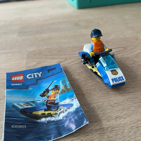 LEGO City sæt nr. 7287. Stort politiskib med lastrum, projektør, politigrej og dykkergrej. Mistænkt minifigur på jet-ski følger med. Skibet kan flyde.