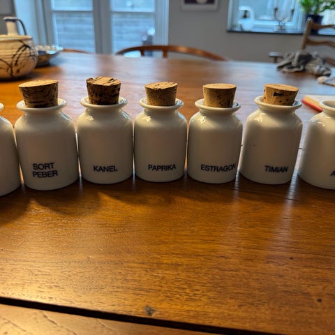 3 fine palsby krukker til sennep, oliven og herbes des provend. Kun en af dem har et låg