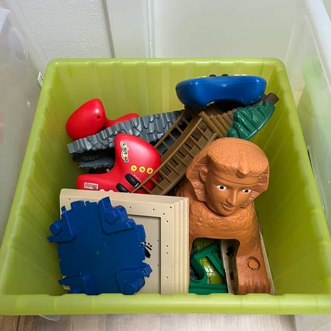 Plasto legetøjssæt til børn. Sættet består af forskellige plastikdele, blandt andet skinner, broer og tilbehør i flere farver, som kan samles til legebaner og miljøer. Leveres samlet i en gennemsigtig plastkasse til opbevaring. Velegnet til kreativ leg og opbygning af egne baner og landskaber.