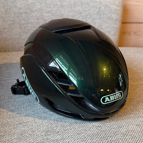 Abus Gamechanger cykelhjelm i hvid og sort. Aerodynamisk hjelm med ventilationsåbninger og justerbart spændesystem i nakken. Velegnet til landevejscykling og gravel.