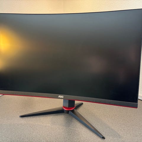 AOC skærm på 27" i sort. Skærmen står på en justerbar fod og med tilhørende strøm- og hdmi kabel som vist på billederne.