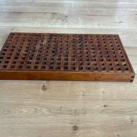 Det er I god brugt stand, dog er det mærker i den øverste plade efter brug af kniv.