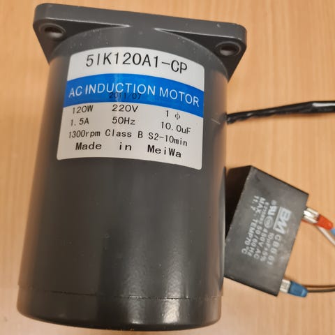 Gearmotor AC Induction Motor 51K120A1-CP elmotor på 120 W, 220 V, 1,5 A, 50 Hz. Motoren er mærket til 1300 rpm, klasse B, og leveres med tilhørende kondensator BM CBB61 10 µF ±5 %, 450 V AC, 50/60 Hz, max. temperatur 70 °C. Velegnet til anvendelser, hvor der kræves en mindre vekselstrøms induktionsmotor med kondensatorstart, som ved pillefyr, pille snegle, blæsere, etc.