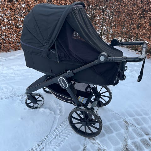 Barnevognen har integreret solsejl og ryglæn.