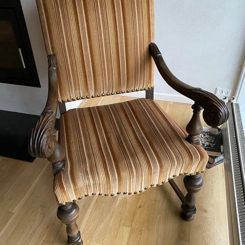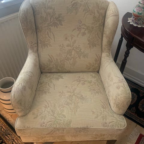 Stolen er meget behagelig at sidde i med god støtte i ryg og armlæn. Står stabilt på mørke træben og fremstår i pæn og velholdt stand uden pletter eller skader (røg- og dyrefrit hjem).