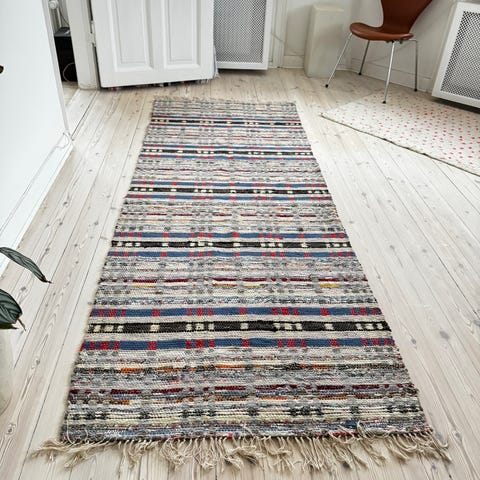Smukt kludetæppe i fine farver, tæppet er 215 cm langt inkl. frynser og ca. 66 cm bredt