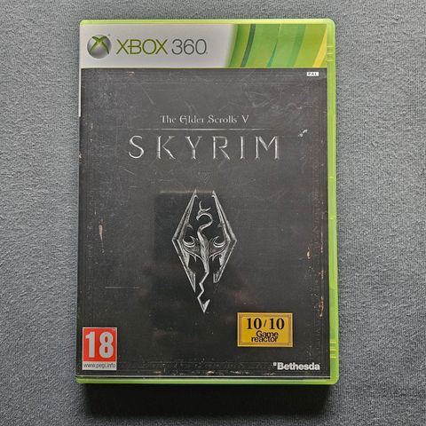 Bethesda The Elder Scrolls V Skyrim Xbox 360 spil. Fysisk eksemplar på disk i originalt Xbox 360-plastcover. Forside og bagside viser spillets titel og grafik. Indersiden indeholder spil-disk og et trykt kort/indlæg. Spillet er klassificeret til aldersgrænsen 15 år ifølge mærkningen på omslaget. Beregnet til brug på Xbox 360-konsoller.