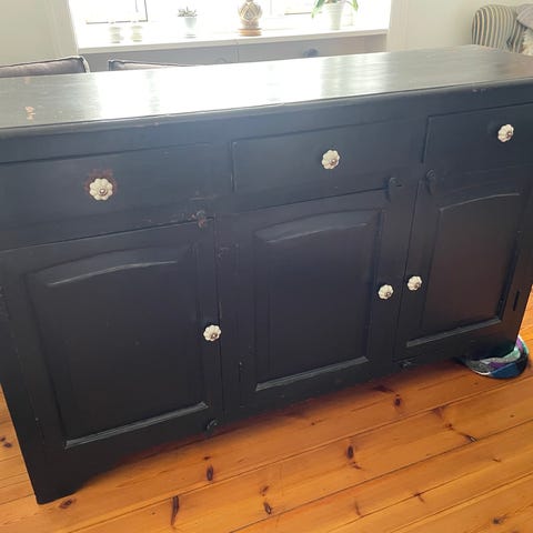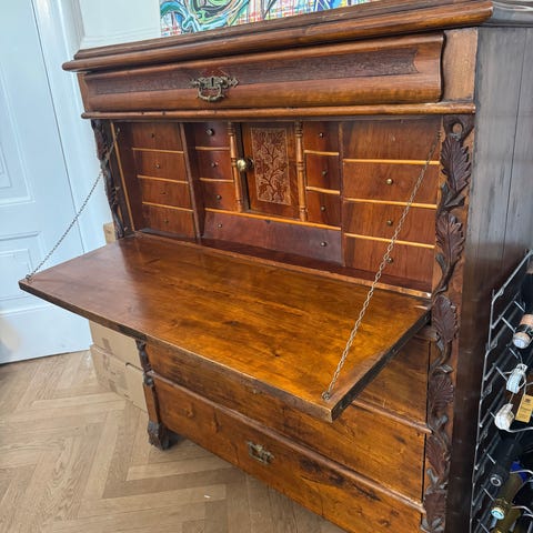 Tre store skuffer, bordplade der kan trækkes ud, små skuffer og spejl. Derudover to hylder. Kan bruges til kreabord eller skrivebord på børneværelse. Den ene skuffe binder lidt.