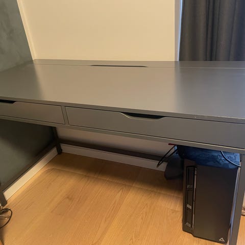 Skrivebord med skuffer og buk. Metalbuk og Alex skuffeelement - begge IKEA - fremstår som nyt i farven mørkegrå. Bordpladen er af fyrtræ og har en del patina, men fremstår rustik og fungerer fint. Tykkelse af bordplade er 3 cm.