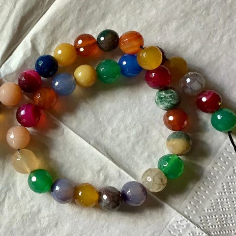 Store flotte AGAT PERLER i multifarver. Perlerne er blanke og glatte og de er hele 14 mm. Strengen er 40 cm og jeg har én streng. Perlerne er helt nye. Vægt 115 gram. OPRYDNINGSPRIS