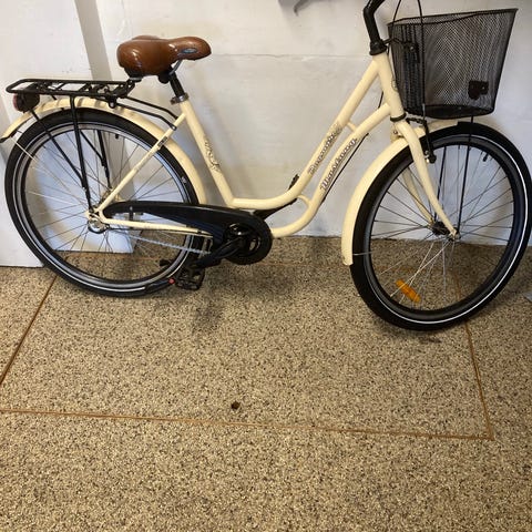 Børnecykel citybike med 26" hjul i hvid farve. Cyklen har lav indstigning, bagagebærer, støtteben, kædeskærm og skærme for og bag. Egnet til større børn, der passer en 26" cykelstørrelse, til daglig kørsel til skole og fritid. Med 7 gear