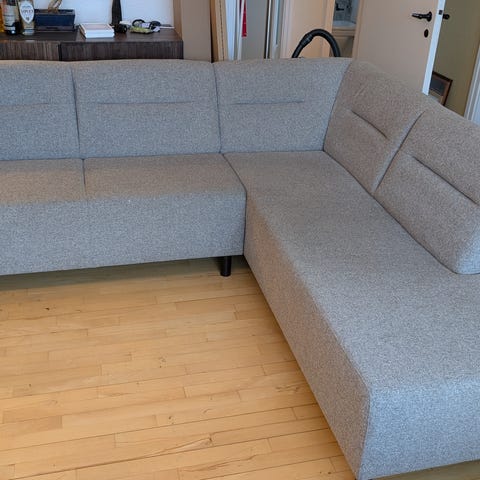 Flot sofa med chaiselong sælges. Er i mærkegråt slidstærkt stof. Nakkestøtte medfølger. Fra røgfrit hjem.