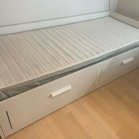 Velholdt sovesofa, som kan laves om til lille dobbeltseng. Sengen har to rummelige skuffer til opbevaring, og der følger 2 faste skummadrasser med sandfarvet betræk med. Sengen står næsten som ny med kun et par ridser på skuffehåndtagene. Madrasserne har altid været beskyttet af vådliggerlagner, så er uden pletter. Sengen er delvist skilt ad og skal afhentes. Nypris 1499 kr.