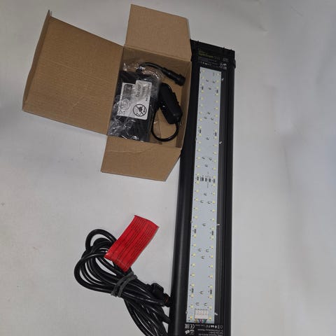 LED akvarielampe i sort med flere runde LED-moduler fordelt på en rektangulær lampeplade. Lampen leveres med strømforsyning, ophængs- og monteringsbeslag samt kabler. Enheden har indbyggede blæsere til køling og kan styres via WiFi-controller og app. Velegnet til montering over akvarium, hvor der ønskes justerbar belysning.
