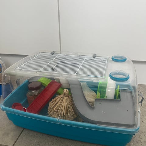 Plasthus til kæledyr i lille størrelse. Huset er fremstillet i hård plast med lysebrune vægge og mørkebrunt tag. Forsiden har en buet indgangsåbning samt en præget vinduesdetalje. Egnet som ly eller soveplads til mindre kæledyr eller som legehus til små figurer og legetøj. Brugt til dværghamster. 14 cm bred, 11 cm høj. Tag kan tages af. Lidt slitage.