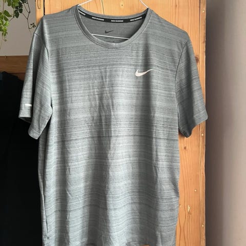 Nike Dri-Fit løbe t-shirt til kvinder i størrelse M. T-shirten har kortærmer og V-hals. Farven er turkis. Fremstillet i let, svedtransporterende materiale velegnet til løb og anden træning. Passer som sportstøj eller fritidsbrug.