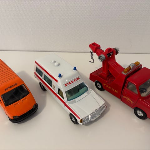 Blandet parti legetøjsbiler i metal. Sættet omfatter forskellige typer køretøjer, blandt andet lastbiler, kranbiler, personbiler og sportsvogne i flere farver. Egnede som samlerobjekter eller til leg. Flere af bilerne viser brugsspor og patina, som er typisk for ældre legetøjsbiler i metal.
