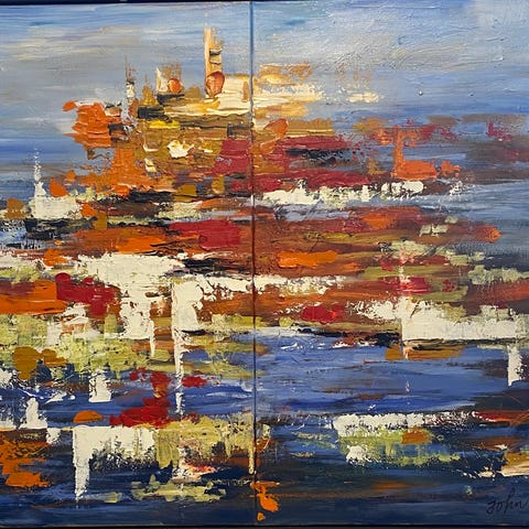Spændende maleri af Kirsten Rudiengaard - mål 33 x 103.