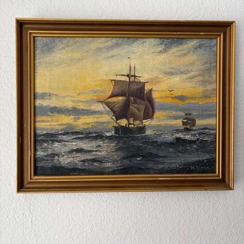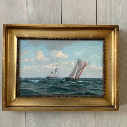 Oliemaleri med maritimt motiv, der forestiller sejlskibe på vandet nær kyst eller havn. Billedet er udført på lærred og indrammet i en klassisk, gylden træramme. Bagsiden viser lærred opspændt på en træramme med ophængssnor monteret. Signatur ses i nederste højre hjørne af motivet.