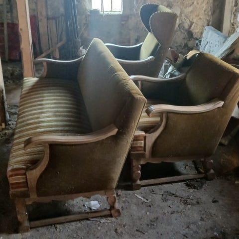 Let lille sofa, en lænestol og bord i egetræ.