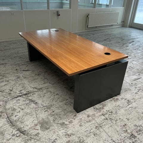 Skrivebord i hæve-/sænk-udgave med rektangulær bordplade i lyst trælook og sorte stelben. Bordpladen har synlig træstruktur og enkelte ridser/brugsspor, som fremgår af billederne. Egnet som arbejdsbord eller computerbord i hjemmekontor eller kontormiljø. Elektrisk højdejustering via betjeningspanel under bordpladen. Bordet står på to T-formede ben, som giver stabilitet og benplads under bordet.