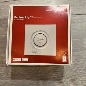 Danfoss Ally Gateway og 4 stk. Danfoss Ally radiatortermostater med adaptere. Gateway-014G2400 fungerer som central styringsenhed til trådløs kommunikation med radiatortermostaterne. Radiatortermostaterne (model 014G2460) er batteridrevne og beregnet til montering på radiatorventiler. Systemet kan anvendes til regulering af rumtemperatur i boliger eller mindre erhvervslokaler via trådløs forbindelse mellem gateway og termostater.