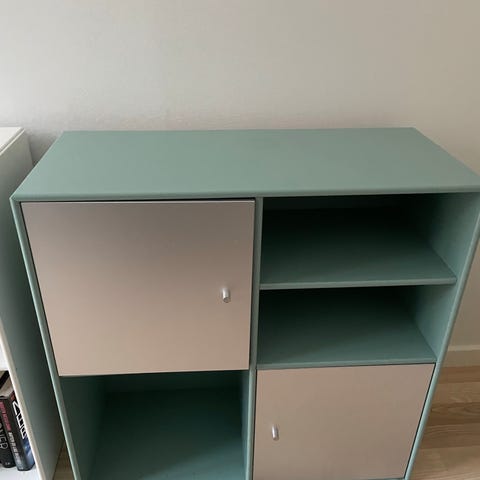Sælger en flot og velholdt Montana reol bestående af tre separate moduler monteret på ben. Reolen er i den elegante farve Coffee, som passer perfekt ind i både moderne og klassiske hjem.