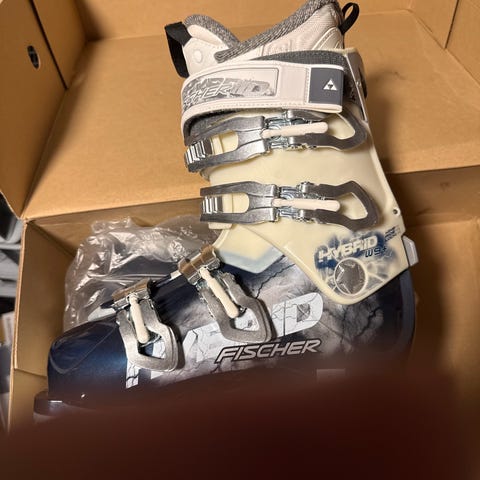 Fischer skistøvler med flex index 90. Støvlerne er sort/hvide med fire spænder og powerstrap øverst. Læstbredde er 103 mm, og størrelsen er 24 MP. Inderstøvlen er lavet i ULTRALON-materiale, og skallen er i THERMOSHAPE. Velegnet til alpint skiløb.