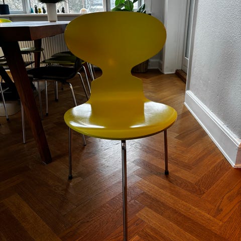Fritz Hansen Arne Jacobsen Myrestol spisebordsstol i formspændt finér med metalstel. Stolen har det karakteristiske myreformede sæde og ryg i rød lakeret finér og slanke forkromede ben. Tre af stolene er sprayet sorte. Velegnet som spisebordsstol eller ekstra stol i køkken, stue eller kontor. Klassisk dansk design af Arne Jacobsen for Fritz Hansen.