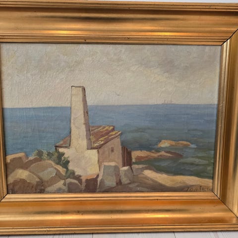 NIS STOUGAARD. Motiv fra Bornholm. Olie på lærred, signeret. Olie maleri på lærred af ukendt kunstner, forestillende et kystlandskab med klipper, hav og huse i baggrunden. Maleriet er udført i dæmpede blå, grønne og jordfarver. Det er monteret i en profileret guldfarvet træramme. Bagsiden viser lærredet spændt på en træblindramme med ophængswire. Der ses håndskrevet tekst på bagsiden af rammen, men signaturen fremstår ikke tydeligt læsbar.