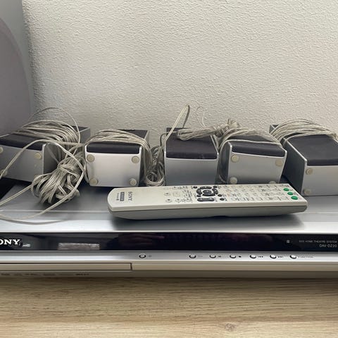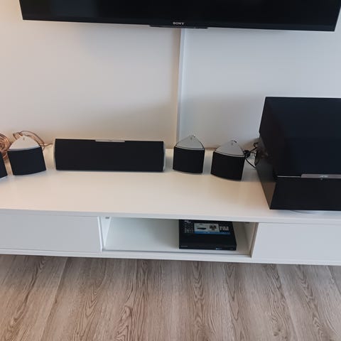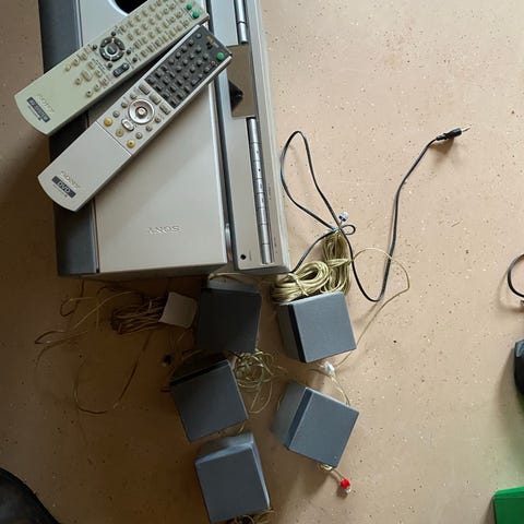 Komplet hjemmebio med fjernsyn, CD/DVD, Sub og 2 satellithøjtalere. 2 fjernbetjeninger og alle nødvendige kabler.