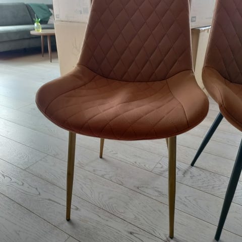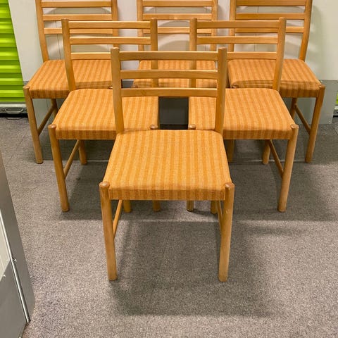 6 sttk spisebordsstole fra Duba Møbelindustri, Orangerødt betræk, brugsspor, to af stolene har polstring som er sunket sammen. 70er vibe, selvom de er fra 1991. Prisen er pr stk, ved afhentning. Sendes ikke.