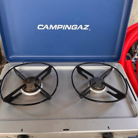 Ukendt mærke gasblus med gasflaske i gulmalet metal. Enheden består af en mindre genopfyldelig gasflaske med bærehåndtag og påmonteret enkeltbrænder øverst. Brænderen har metalrist med flere gryderist-arme til placering af kogegrej. Egnet til madlavning og opvarmning udendørs, f.eks. camping, have eller værksted, hvor gasudstyr må anvendes.