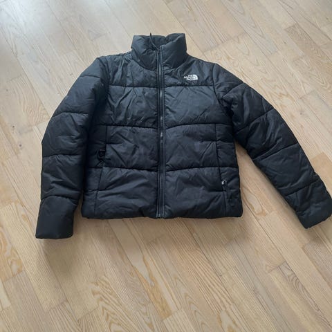 The North Face vinterjakke til kvinder i størrelse M. Jakken er sort. Den har hætte og længde ned over hofterne samt bælte i taljen. Den har for i. Logo fra The North Face på skulderen og mærke indvendigt med angivelse af størrelse M/Womens.