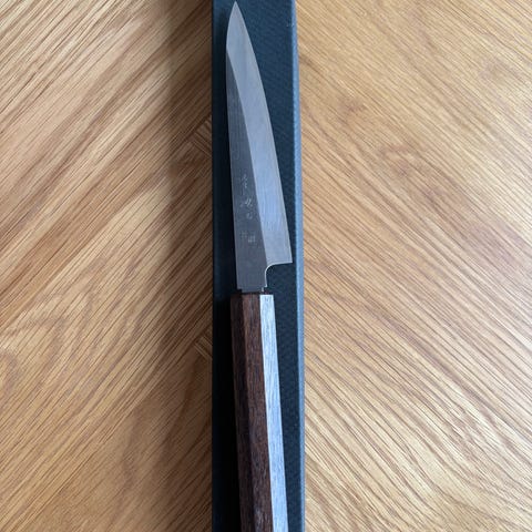 RESERVERET En af de for tiden mest "jagtede" japanske knive. Nærmest uopdrivelig serie fra Tetsujin / Myojin, der kun frigives i ekstremt få eksemplarer, ved lodtrækninger osv. Jeg har valgt at fokusere mest på at få knive i aogami og shirogami fra Nakagawa, Tanaka, Kagekiyo, Hitohira, Yoshikane, Mazaki osv, så denne ginsan sælges. Helt ny og ubrugt med original lak på klingen der i øvrigt gør det svært at tage foto af "alloy-bandings"...
