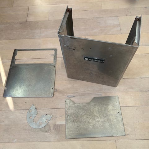 Rancilio espressomaskine i rustfrit stål. Maskinen har virker men har grundet konstruktion af bunden rustet op ud for den rustfrie dryp bakke. Kan anvendes evt som reservedele eller som den er.