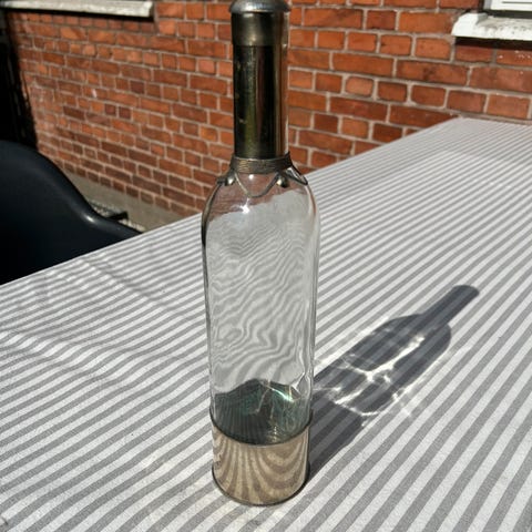 Vandflaske, glas, læder og lommeflaske i 925 sterlingsølv, 800. Flaskedekorationen er let bulket, ligesom låget, se billeder. Standen er fremragende. Korken holder og lækker ikke. Jeg sælger fra en hjemmesamling. En sjælden vare for samlere.