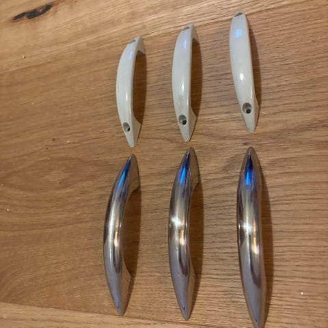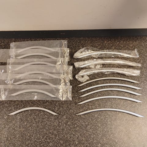 Greb, børstet stål, mål og udseende som på billeder. 20 stk i alt. 15 kroner pr stk eller 250 kroner samlet. Skal afhentes, sendes ikke.