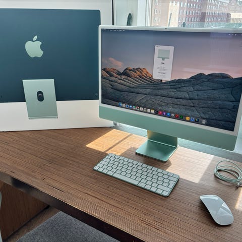 Apple iMac stationær computer med 24" skærm. Modellen er fra 2021 og er udstyret med Apple M1-chip og 8 GB RAM. Kabinettet er i rød farve. iMac’en kører macOS og egner sig til almindeligt kontorarbejde, internetbrug og medieafspilning. På billederne ses også en Apple Magic Mouse, som tilsluttes trådløst til computeren.