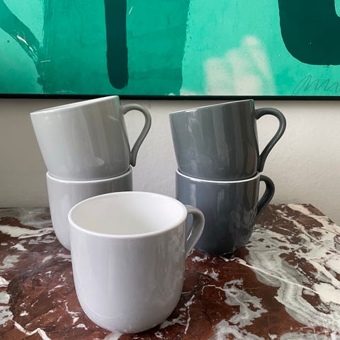 Stelton krus i lyseblå porcelæn. Sættet består af to cylindriske krus med rund hank og hvid glasur indvendigt. Velegnet til varme drikke som kaffe, te eller kakao. Bunden er mærket med Stelton-logo.