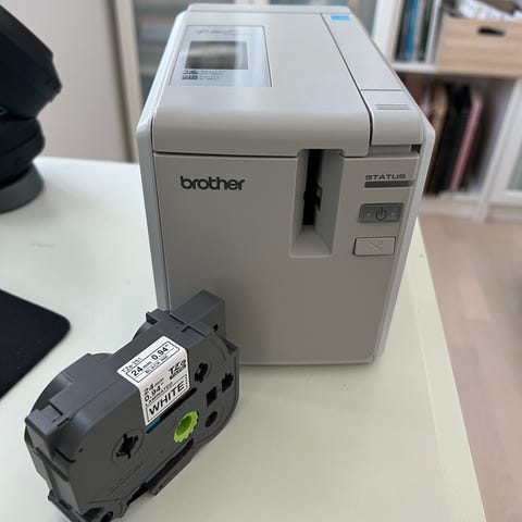 Brady BMP21-PLUS labelprinter, håndholdt model i gul/sort plast. Enheden har indbygget tastatur med tal og bogstaver samt funktionstaster til udskrivning og formatering. Displayet viser tekst og indstillinger før udskrivning. Labelprinteren anvender udskiftbare kassetter, her vist med sort skrift på hvid vinyl, 19,1 mm bredde (3/4"). Bagpå er der batterirum til drift med AA-batterier. Velegnet til mærkning af kabler, udstyr og andre genstande, hvor der ønskes holdbare labels.