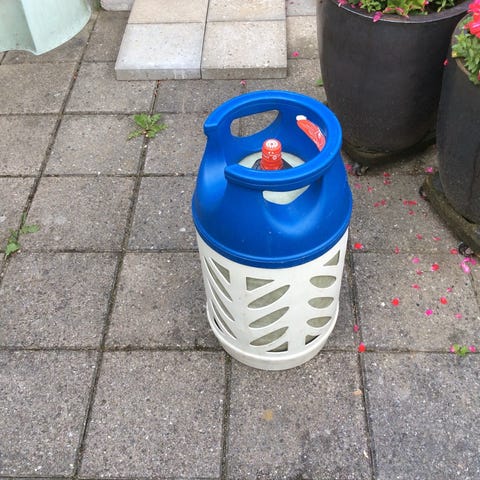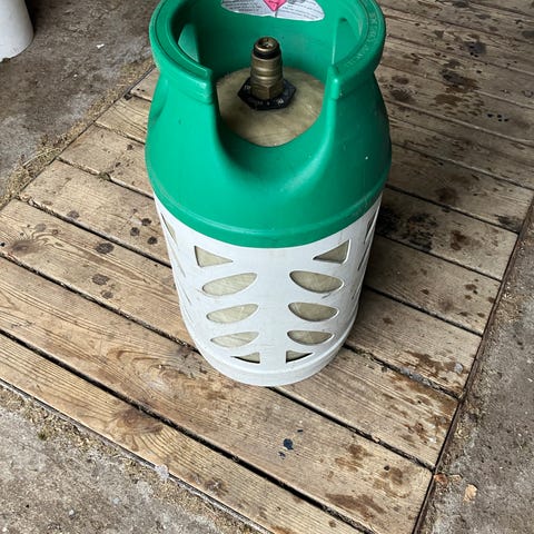 Gasflaske i kompositmateriale i grøn og hvid. Egnet til brug med gasgrill, terrassevarmer, campingudstyr eller andre gasapparater, der passer til denne type flaske. Lettere end traditionelle stålflasker og med bærehåndtag i toppen for nem håndtering.