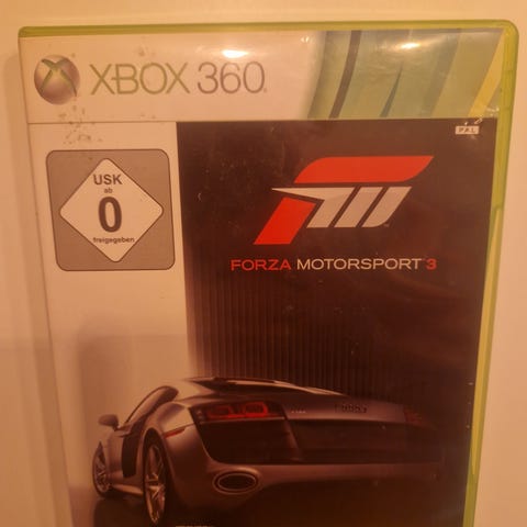 Forza Motorsport 3 Xbox 360 spil. Racing-spil til Xbox 360 med to diske i standard plastcover. Spillet understøtter Xbox Live og er den tyske udgave, som angivet på omslaget. Egnet til brug på Xbox 360-konsoller, hvor man ønsker bilræs og banekørsel med forskellige biler og baner.