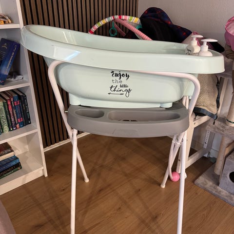 Baby badekar med stativ og i rosa plast. Badekarret er monteret på et hvidt metalstativ, som hæver badekarret til en behagelig arbejdshøjde. Der er integrerede rum til sæbe og småting ved siden af karret. Egnet til badning af spædbørn og småbørn i hjemmet, hvor man ønsker en stabil og praktisk løsning til babybad.