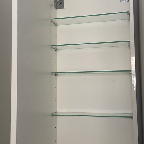 Badeværelsesskab, der maksimerer vægpladsen og er perfekt til opbevaring af toiletartikler på hylder. Skabet har 4 stærke glashylder. Låge i hvid højglans.