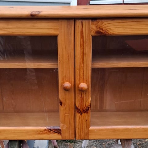 Skab i fyrtræ, med to glaslåger og to lukkede skuffer.