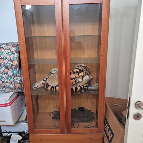 Skab med glaslåger og to skuffer